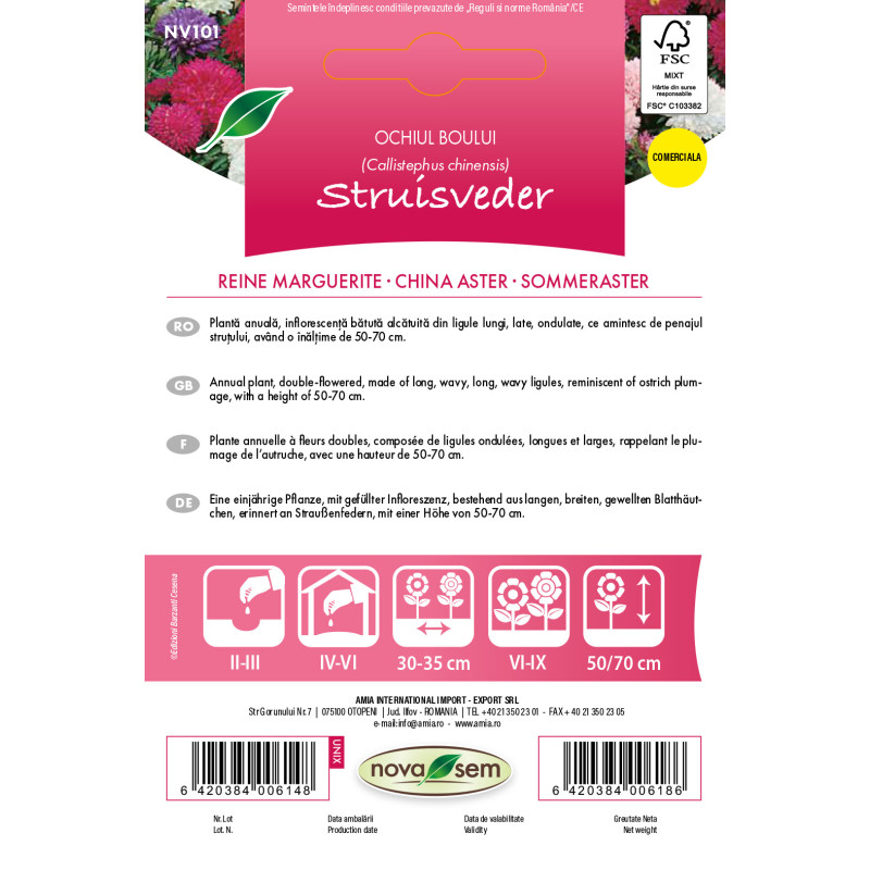 Planta anuala cu inflorescenta batuta alcatuita din ligule lungi, late, ondulate, ce amintesc de penajul strutului, cu o inaltime de 50-70 cm de la Amia International.